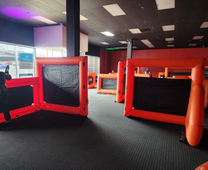 L’espace nécessaire dépend du nombre de joueurs. En général, un espace de 2500 pi² est suffisant, mais un espace plus grand est idéal pour une expérience plus immersive. Nous pouvons organiser des parties dans des espaces plus petits, mais il faut tenir compte des murs gonflables et du fait que les participants doivent courir pour profiter pleinement de l’activité.